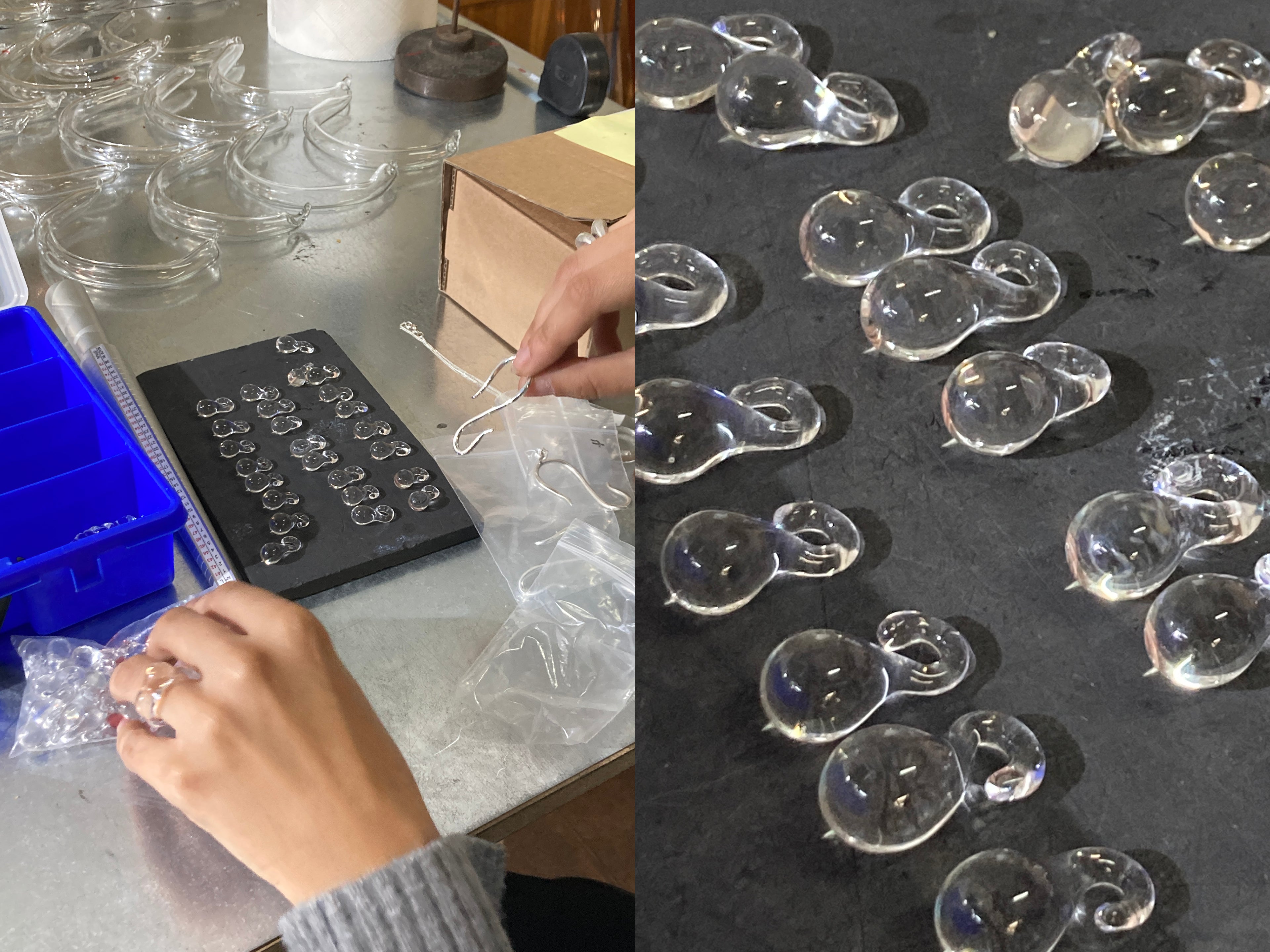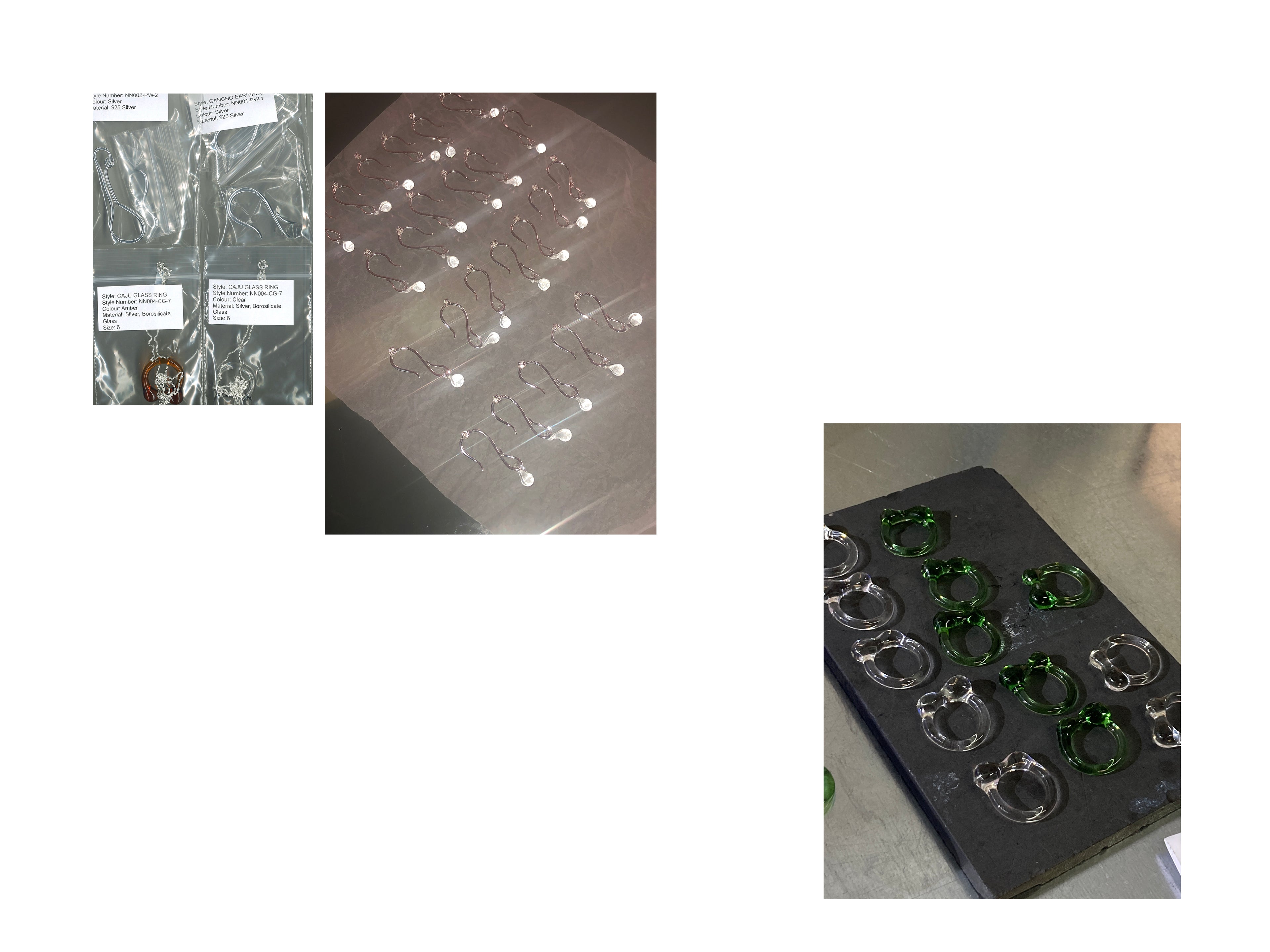 We’re happy to release our first limited jewelry capsule in collaboration with Nathalie Schreckenberg. These exclusive pieces are made from reused sterling silver, hand-blown glass, and are intended to be worn invariably; necklaces become bracelets, glass rings become objects to be worn around your neck, and the earrings are designed to be worn both day and night.