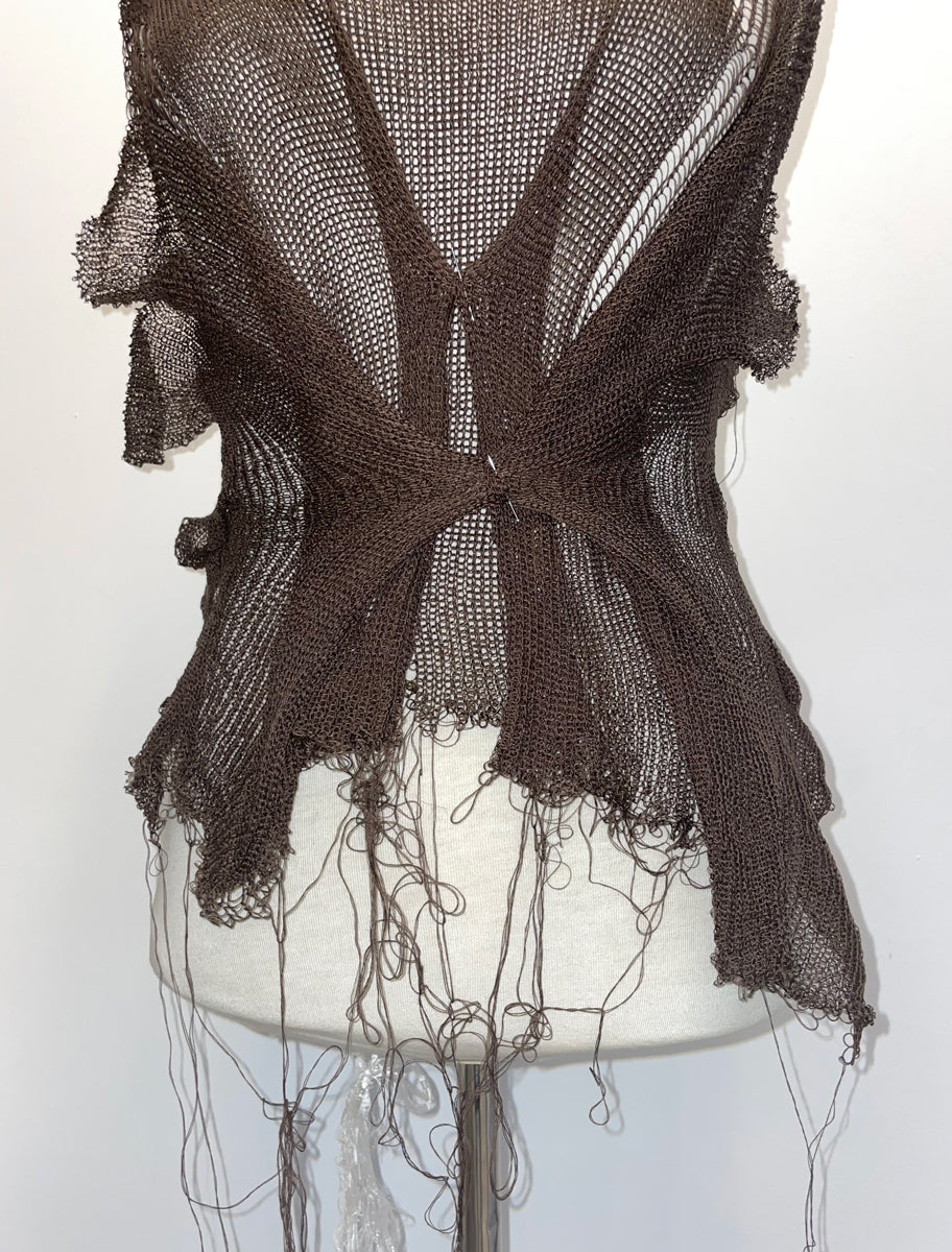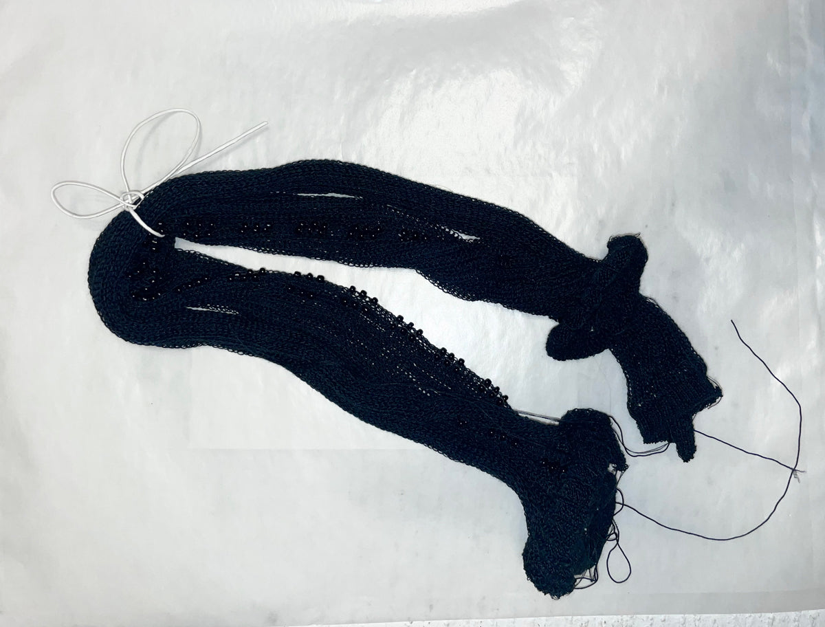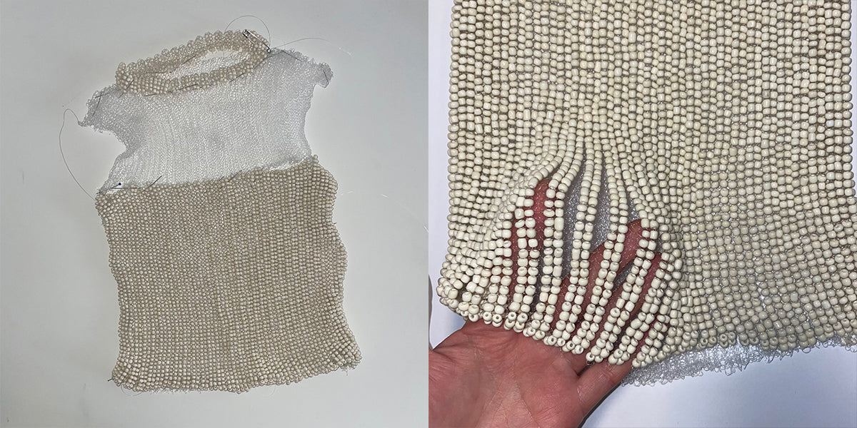 We quickly talked about beads. This a time-consuming technique as each bead is inserted individually and row by row. It is a technique that represents well the preciousness of hand labor. I particularly like associating beads with transparent yarns, as it gives the feeling that the beads are little touches of colors on the body.