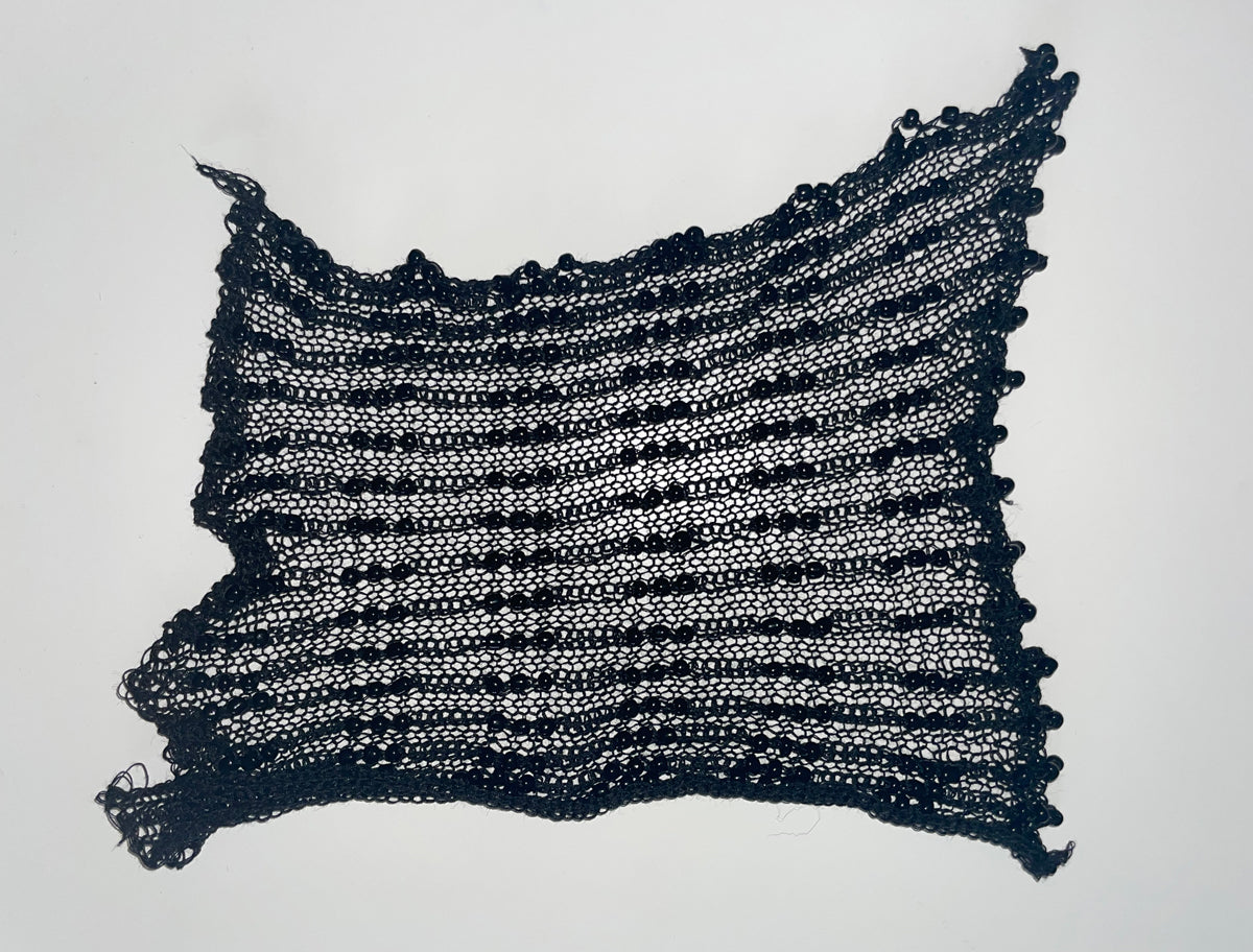 We developed three different knitting techniques (a transparent nylon yarn with condensed beads, a very thin sewing yarn with a different bead rhythm, and a thin open-stitch knit which gives an impression of error and imperfection). These choices are interesting because the beads give a soft and sophisticated look while the open-stitch fabric looks raw. By working mostly in ribbing, the garments are stretchy and adapt to different bodies. The graphic evolution of the knitwear will also change depending on the person wearing it. Offering one-size-fits-all clothing was an important matter for this project.