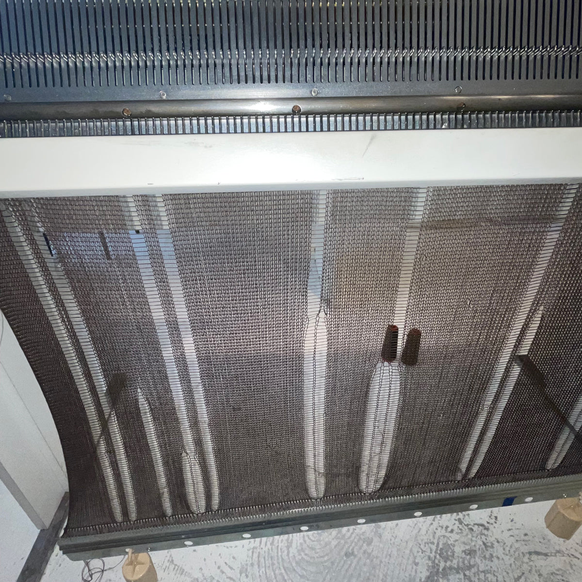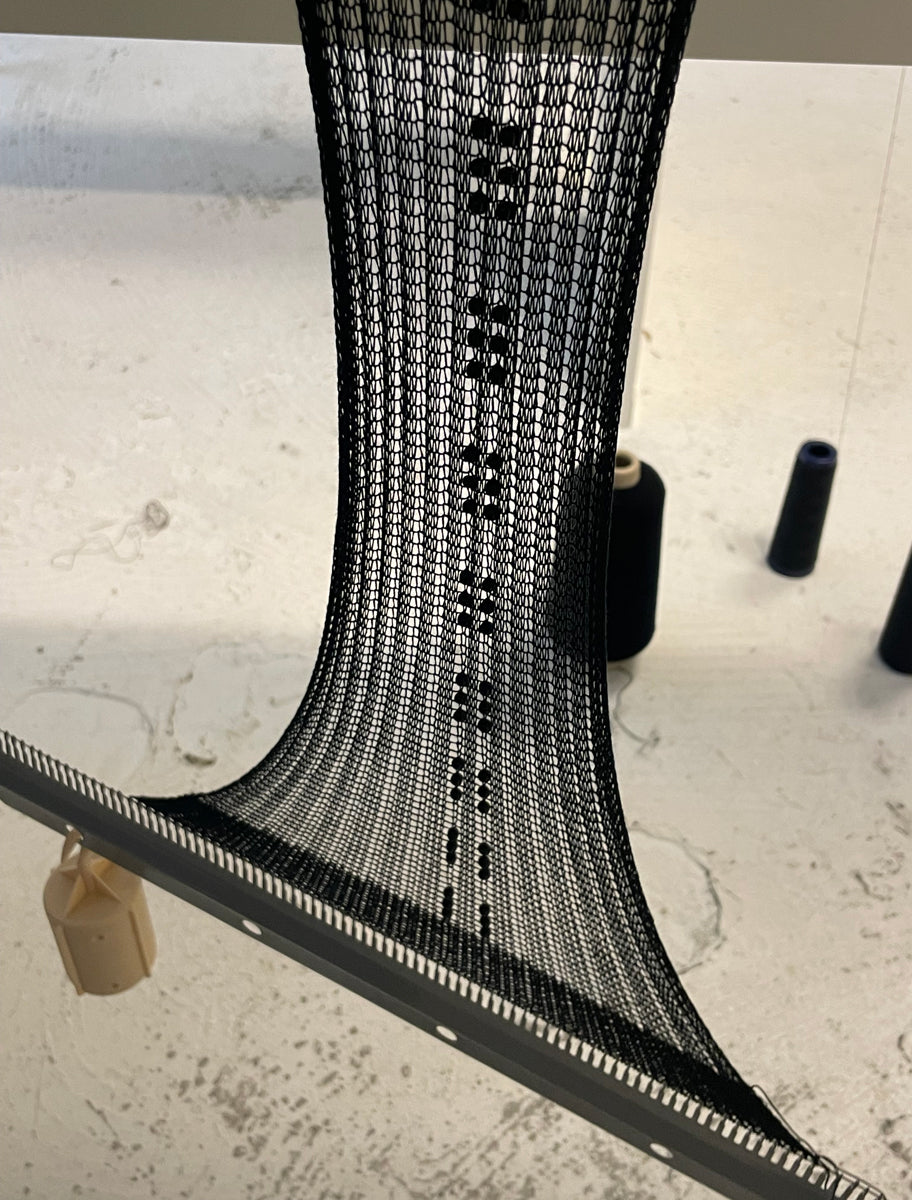 I work with domestic knitting machines. These are machines where human hands are needed (unlike industrial machines). Every movement and every change of stitches, colors, textures, and patterns is done by hand. You can feel and perceive the creation of the fabric happening and modify and adjust it fluidly.