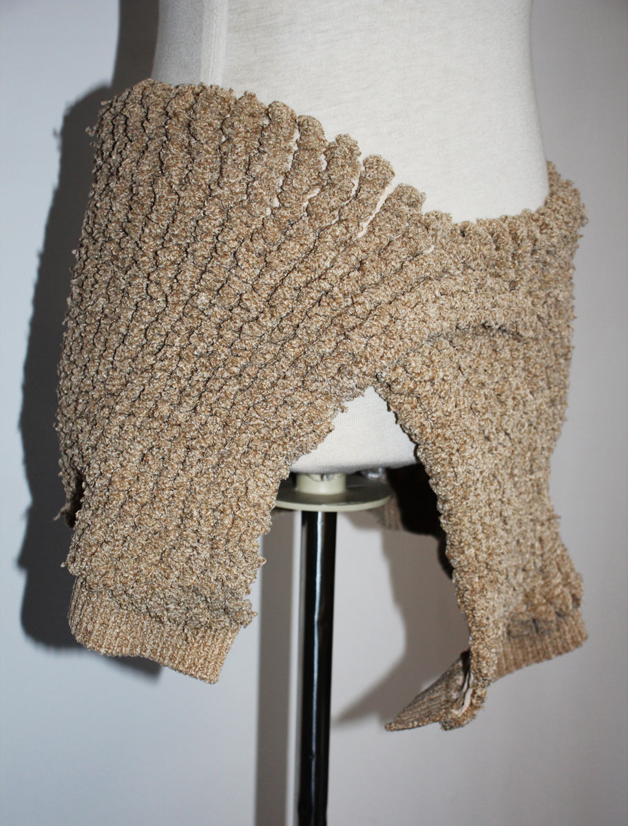 I work intuitively with an initial projection and idea of texture that I associate with a technique and a yarn to play with. Most of the time, I do not arrive at what I expected, but hopefully, during the process, I discover new effects, new textures, and several curious knits. I rework the results in a series of variations. A small technical or yarn variation can change the whole look of the knitted piece.