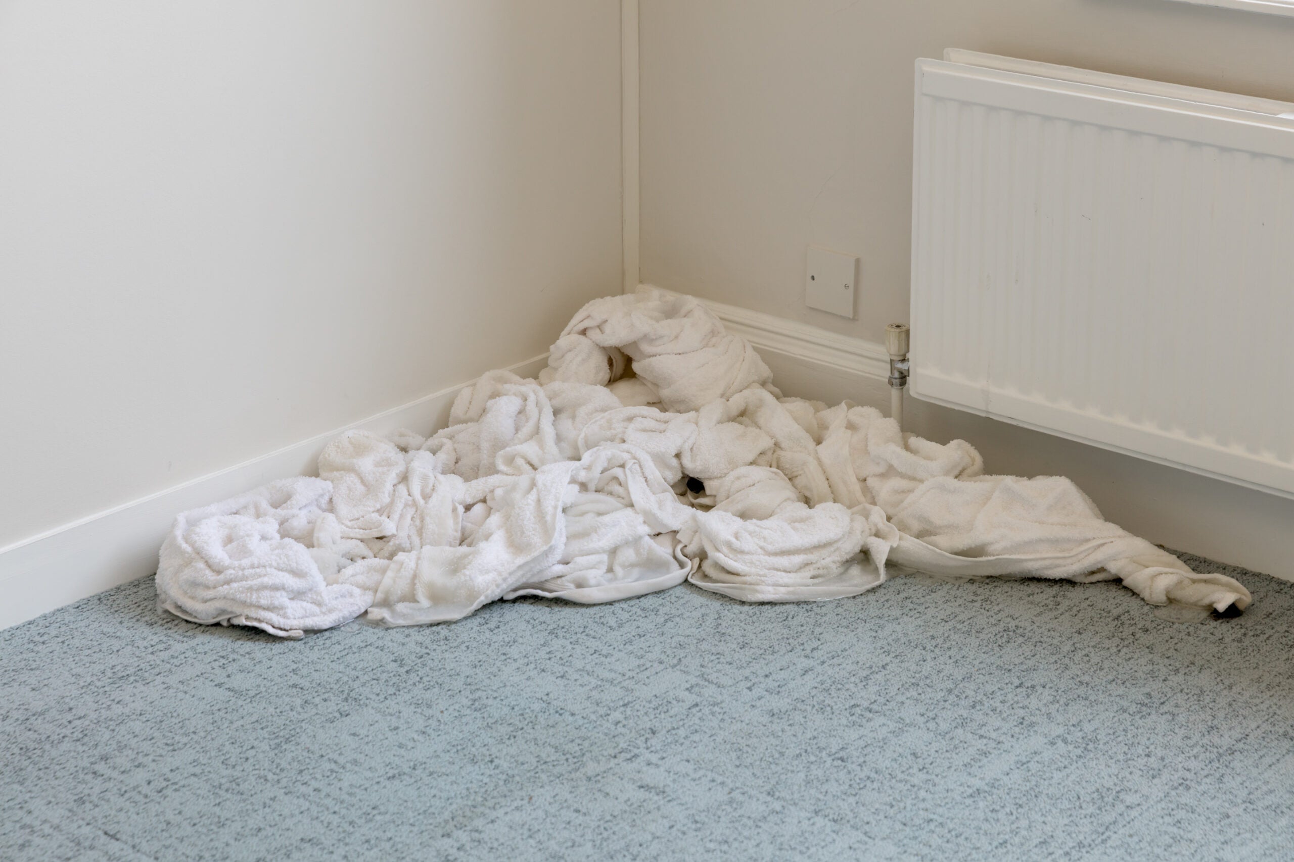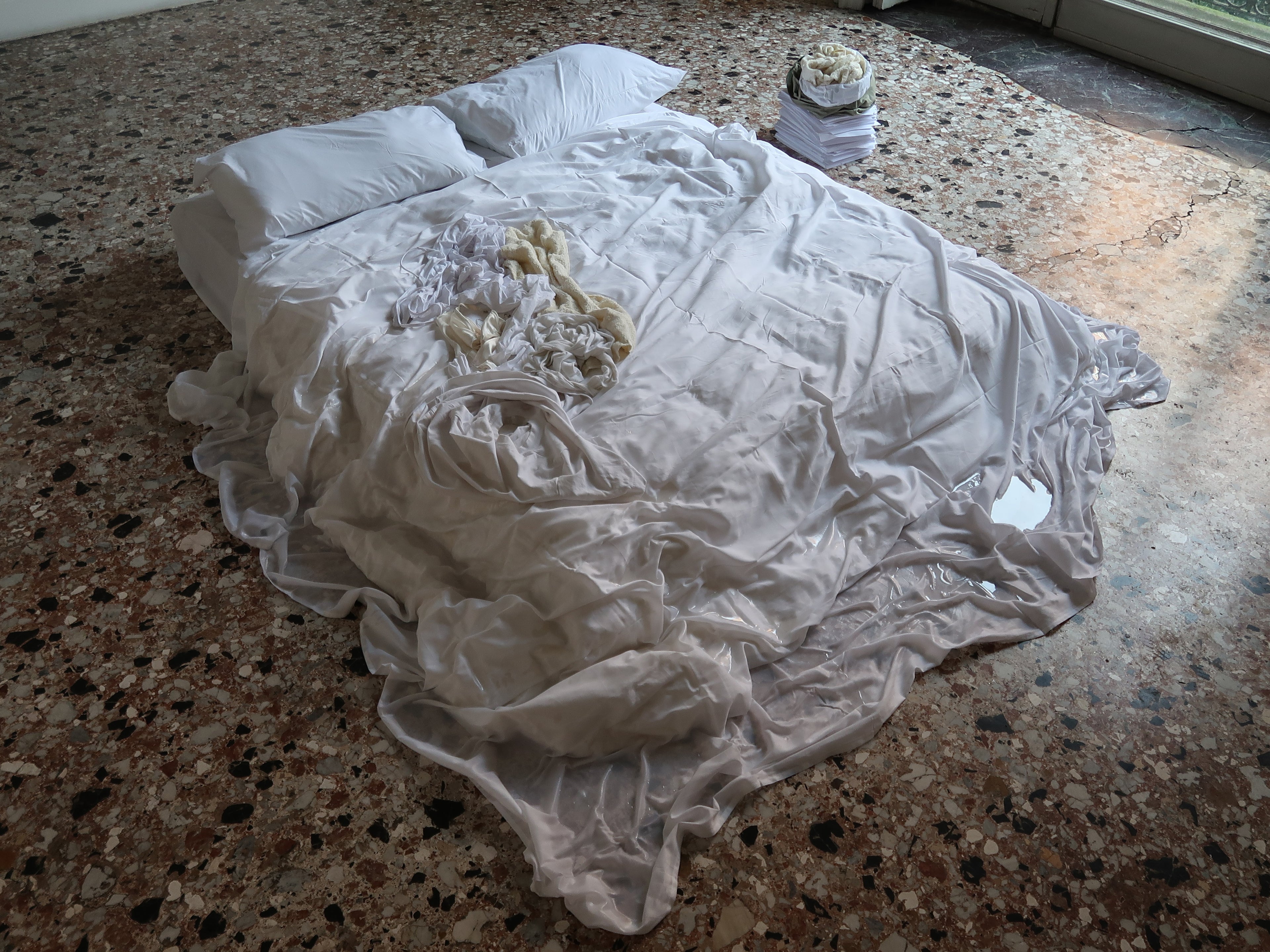 “A thousand times the same floor, with a different movement, with a different intime clothing item, with a different day or night. Her action overflows in time and enters the space without a drop of innocence. It contains solid fluids and the ever-present mausoleum of the house she brings with her, allowing us to feel a sense of relief in how static it has become, so inert, but a moment nevertheless, a moment now silent. That sanitization produces envy, as to conduct your intimate and unguarded self so far beyond the habitual. The handles of a bathroom are elevated from the material of its context and resurface like a balsamed body, recognizable even in its unusual reutilization.”