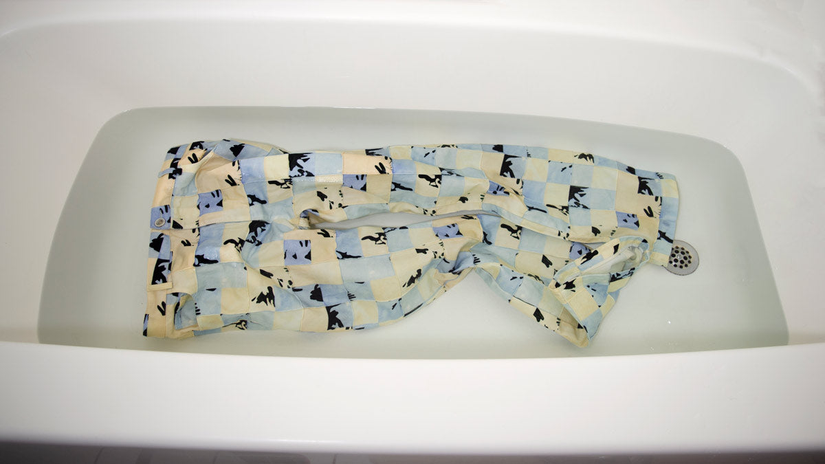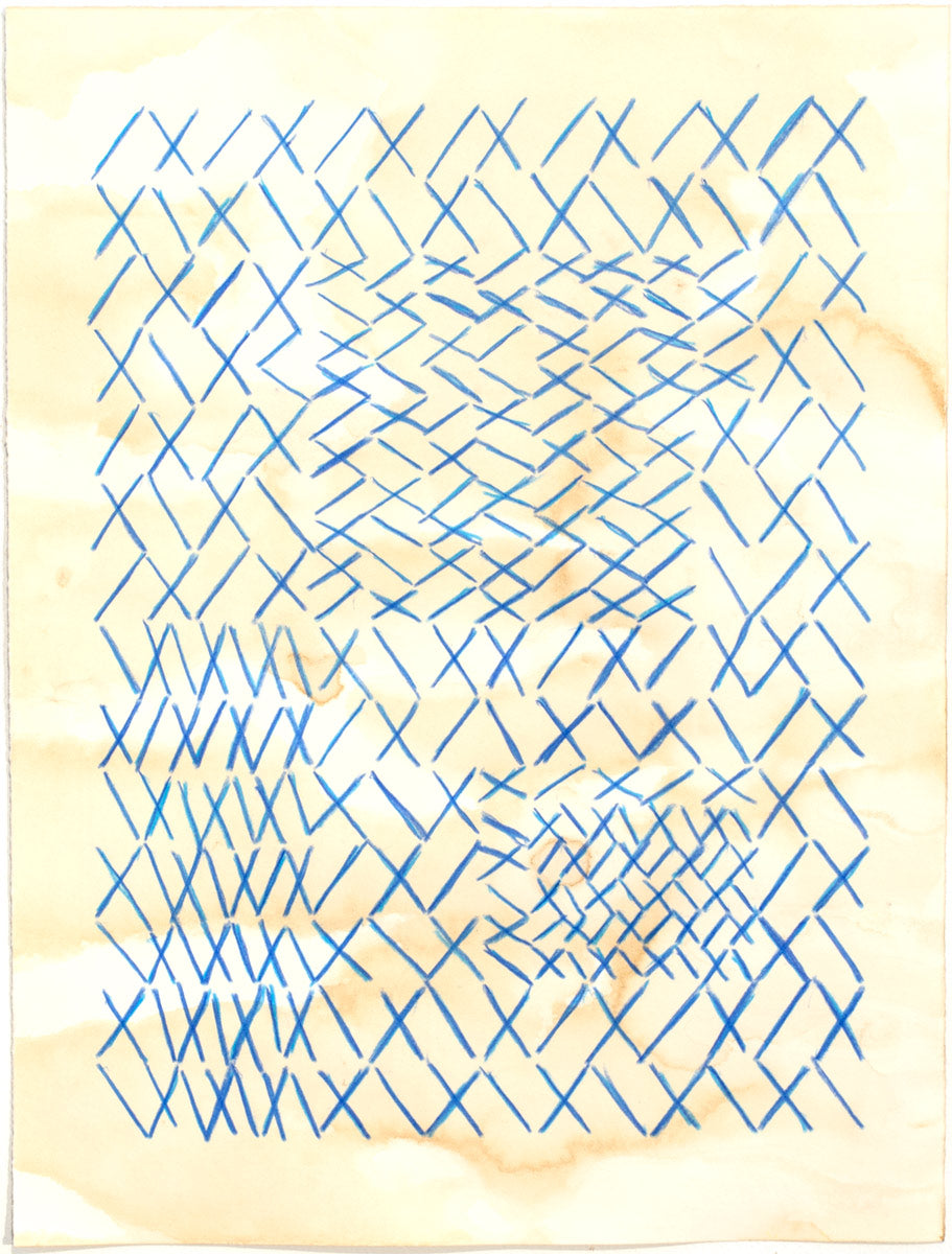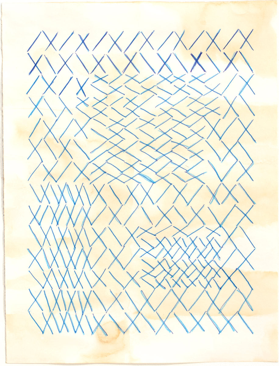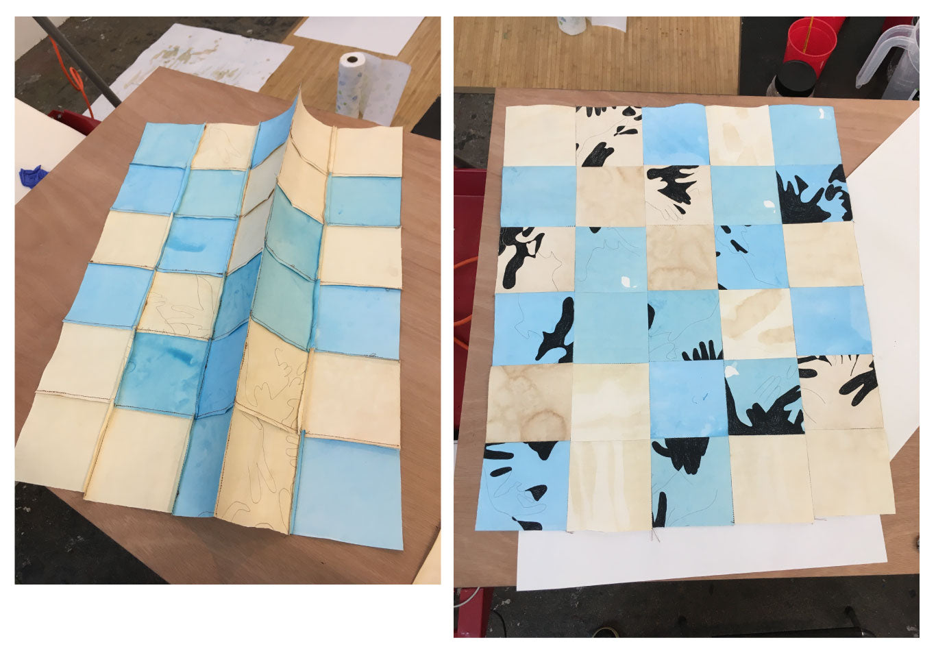 In college, I worked part-time as a lifeguard. I spent a lot of time observing how the pool tiles seemed to wiggle against the rippling water. This led me to make a series of drawings that tried to capture the distortion and movement of the grid. I used those drawings as the inspiration for this collaboration. My goal was to create a pattern that played with movement within a clear structure. I stitched together square units of dyed paper to establish a grid structure. I used two colors, blue and tan, to create a conceptual contrast between wet and dry. On top of the grid, I drew distorted images of my hands in black pencil. The result was a kind of visual rhythm that I felt would translate well to fabric.