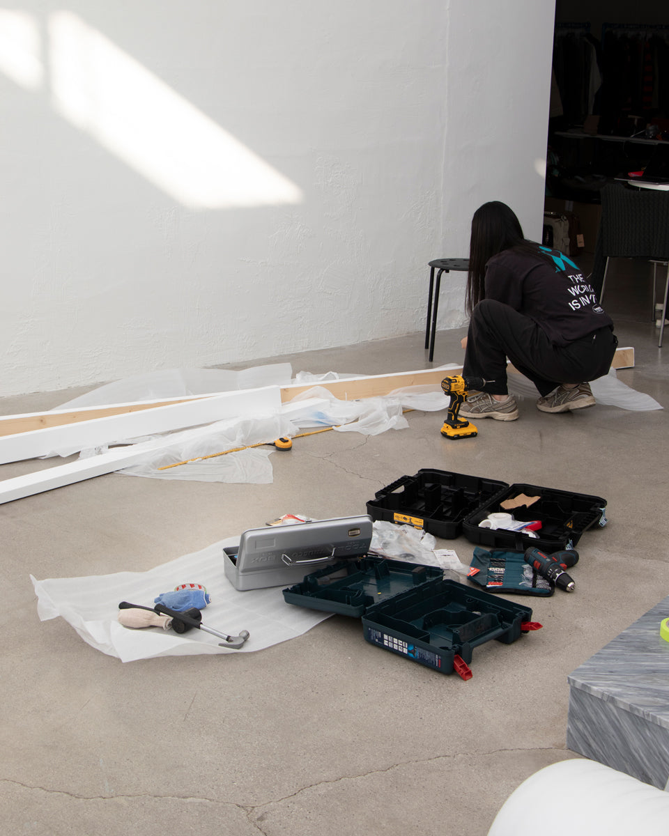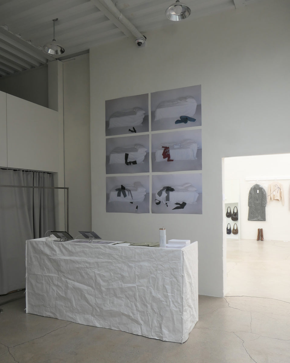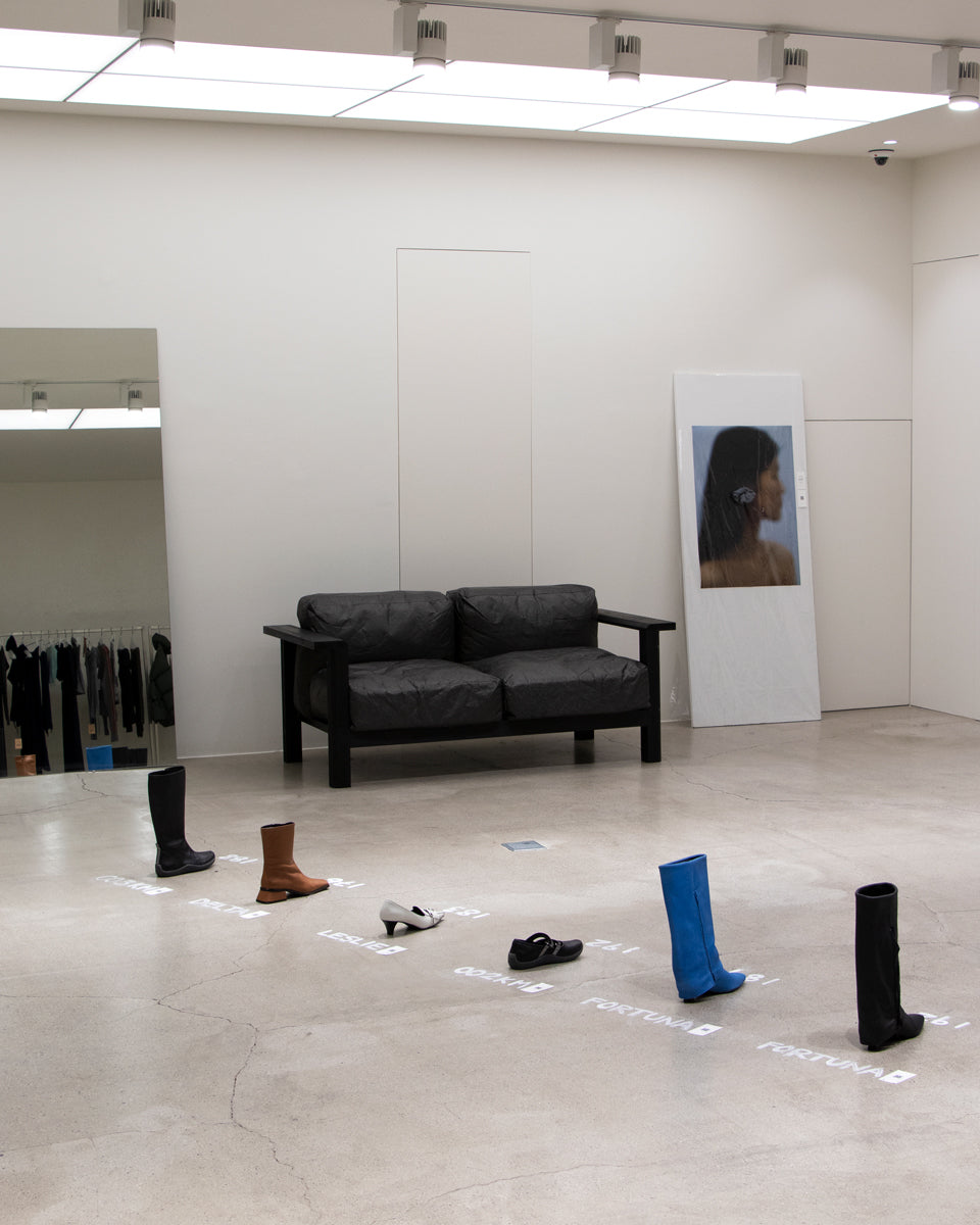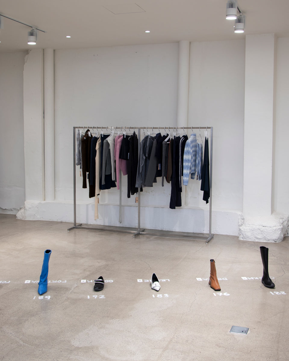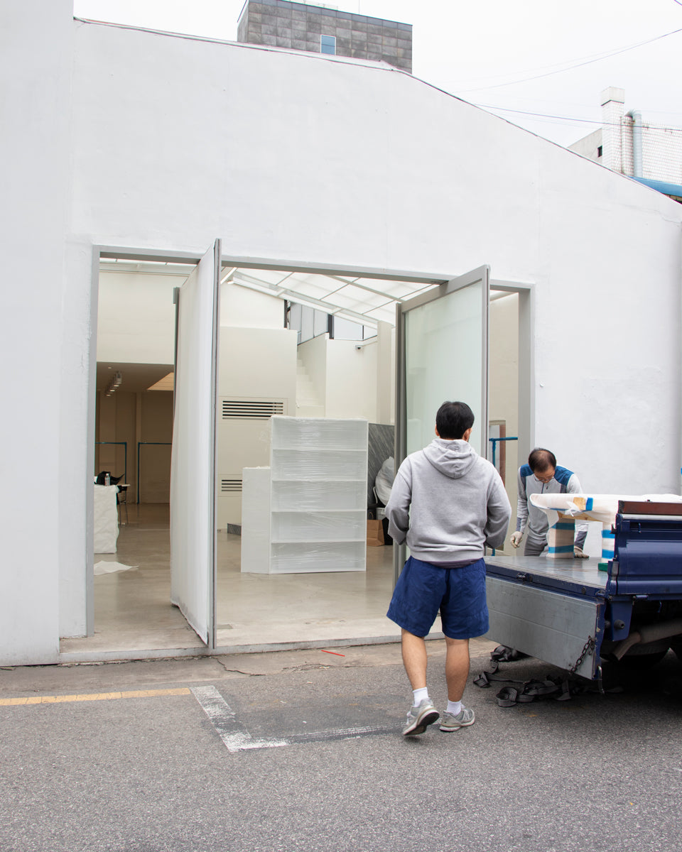As this is Paloma Wool's first show to encounter Korean customers in Seoul, we focused on designing a space that could fully express the brand and the concept of pure and honest use of various materials. In line with the neutral concept of main items of clothing, the furniture is basically designed in white and black but has solid points with wooden furniture like chairs and benches. Also, for the poetic and delicate aesthetics of the brand's mood, we chose Tyvek fabric as the primary material to express translucent and misty feelings in the space. The fitting rooms are entirely covered in this white and bright paper-textured material, with the intention of highlighting PW's items by illuminating the background when they are worn and photographed. And since it's a pop-up event, we tried to design every element that can be easily assembled and dismantled in a simple system.