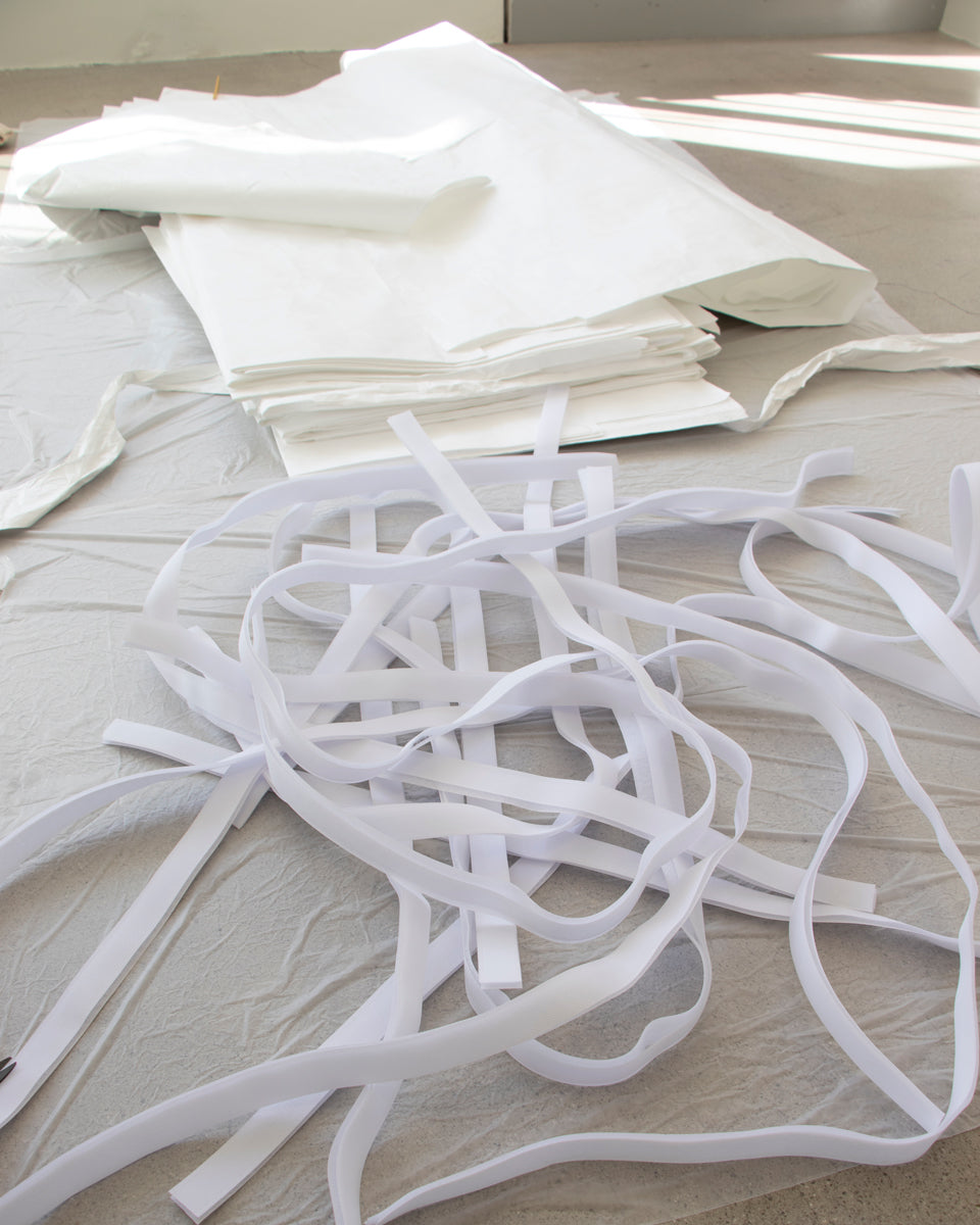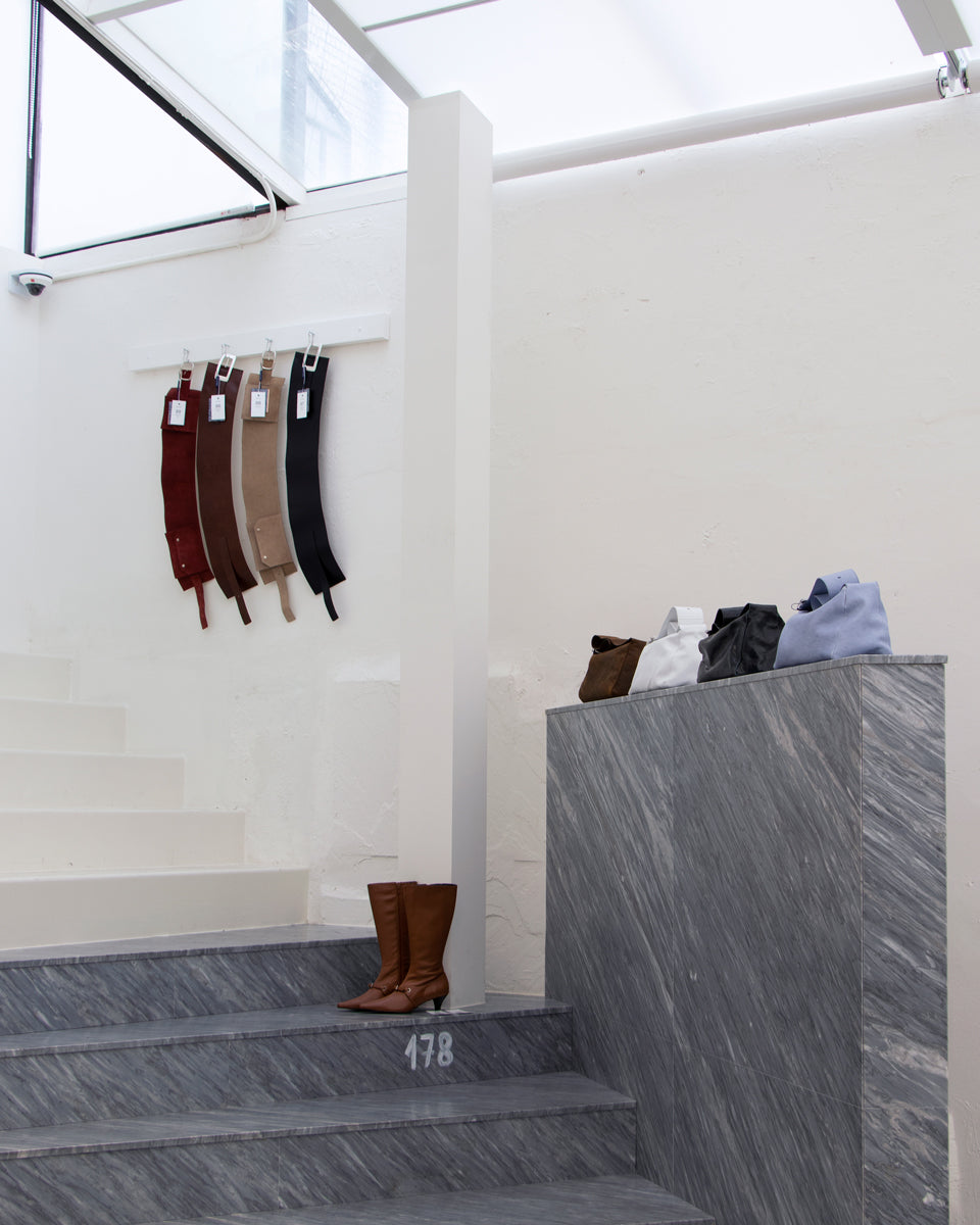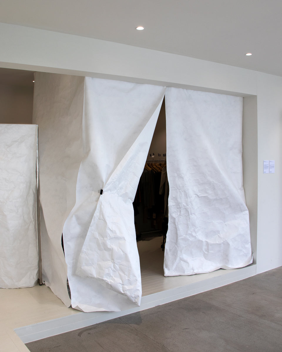 According to our interest in experimenting and investigating new materials and making methods that we haven’t dealt with, we’ve been using and challenging various types of materials in compliance with each project’s brief and needs. For instance, this time for Paloma Wool, the brief was to create a space that was calm and with a pure mood that could light up the project pieces. We used Tyvek fabric as a primary material with a pure white color and a paper texture. With this versatile and recyclable material, we’ve created window screens, checkout desks, sofas, and changing rooms. Tyvek is not familiar with being used on more oversized furniture, especially for the changing rooms, so it was pretty challenging but a fresh choice at the same time. It has such a poetic texture and subtle transparency when the light enters the space, which is our most loving moment.