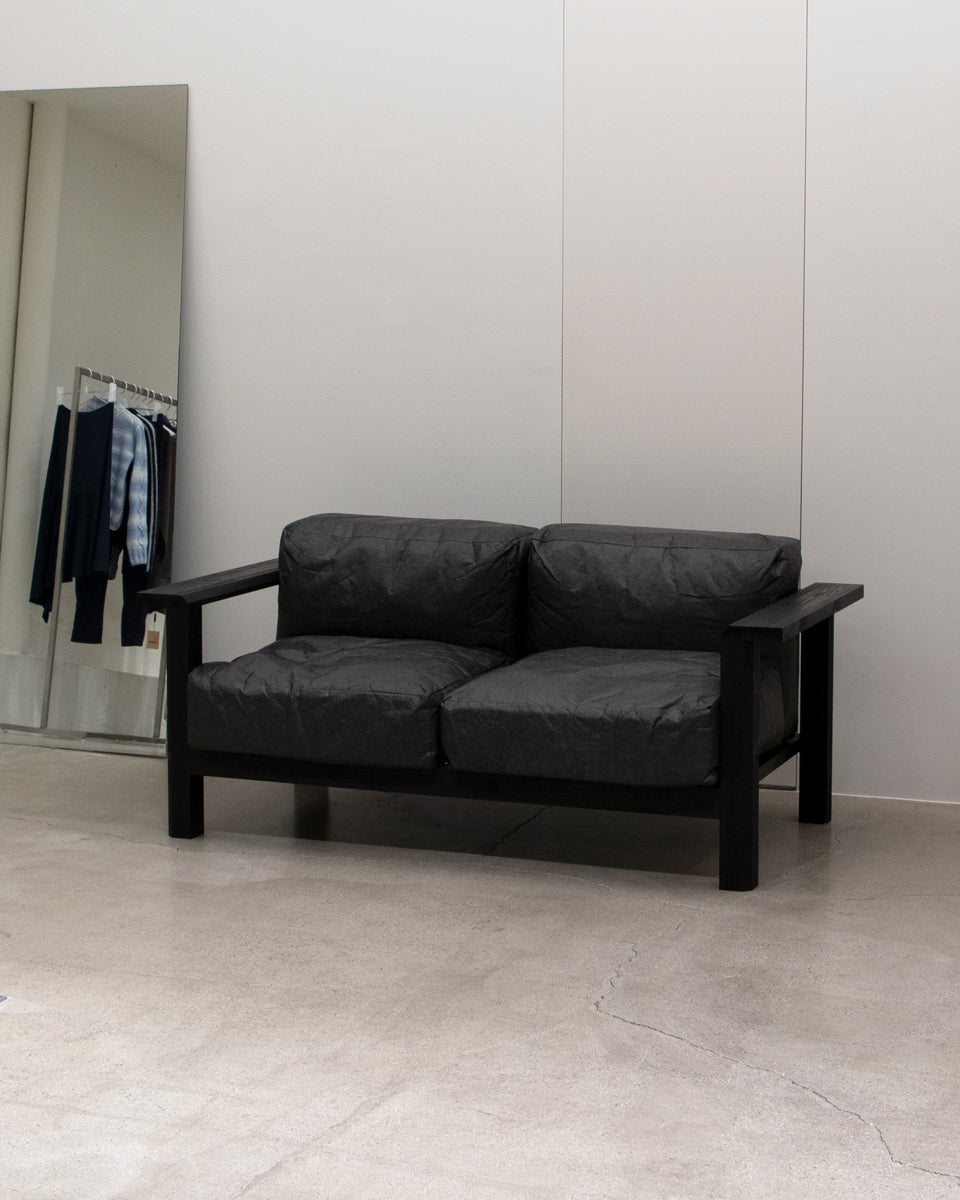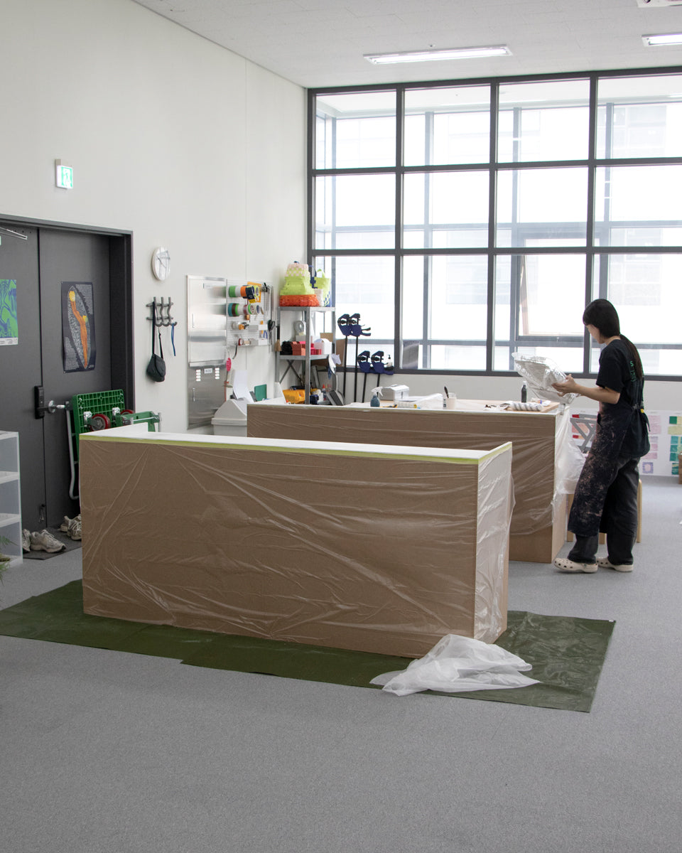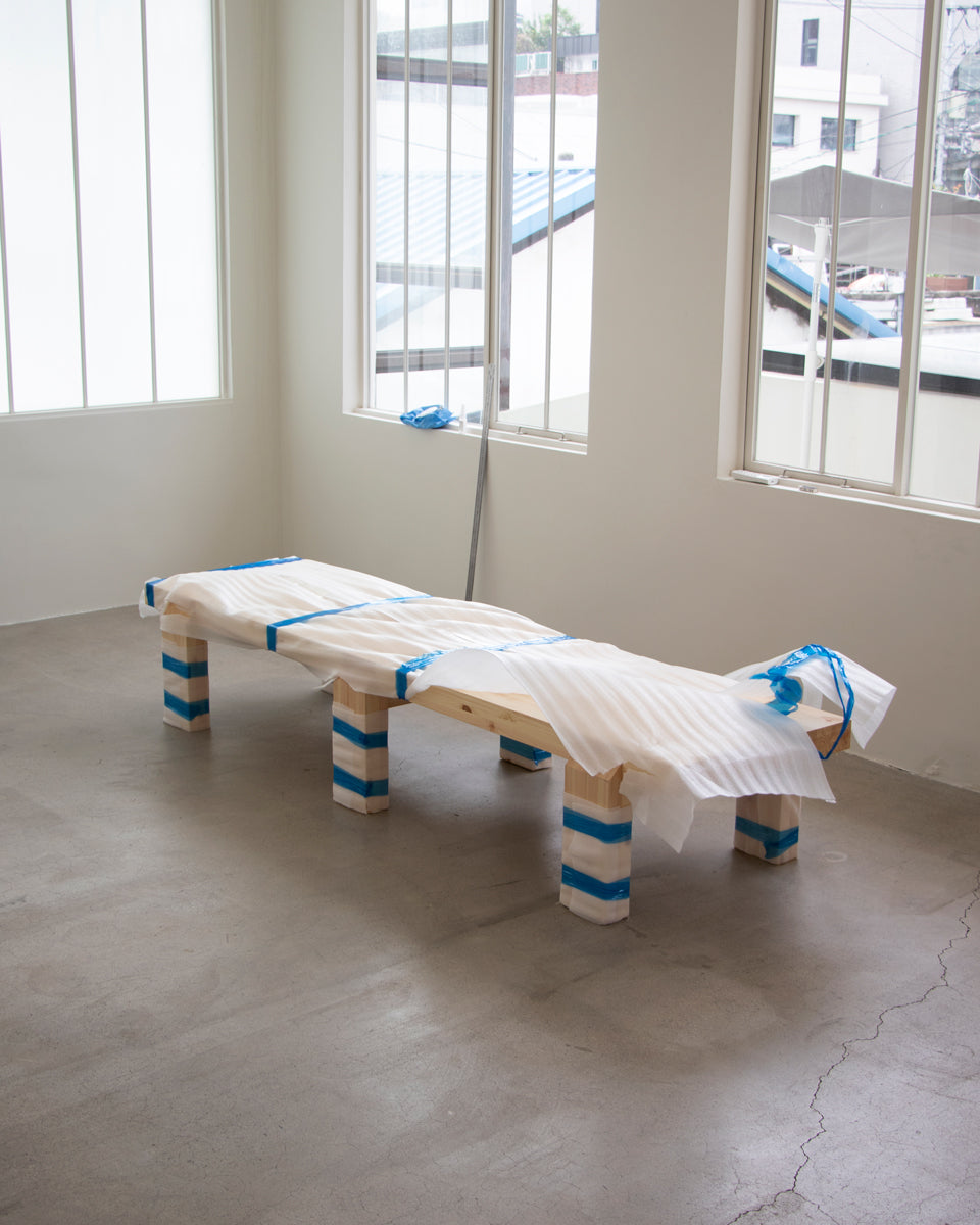 Thanks to this event, we were able to develop our PEEL WOOD furniture series. This time, we designed and produced a new sofa with a frame made of pine wood and cushions covered in Tyvek fabric. We thought it would be interesting to combine the bold, solid design language of the original work with the crumpled texture of Tyvek. Since it was our first trial to experiment with Tyvek and a cushion-type sofa, we struggled to find a good level of comfort and quality. Still, we were finally satisfied with the results when we heard positive feedback and saw visitors sitting and resting comfortably on the sofa in the pop-up space.