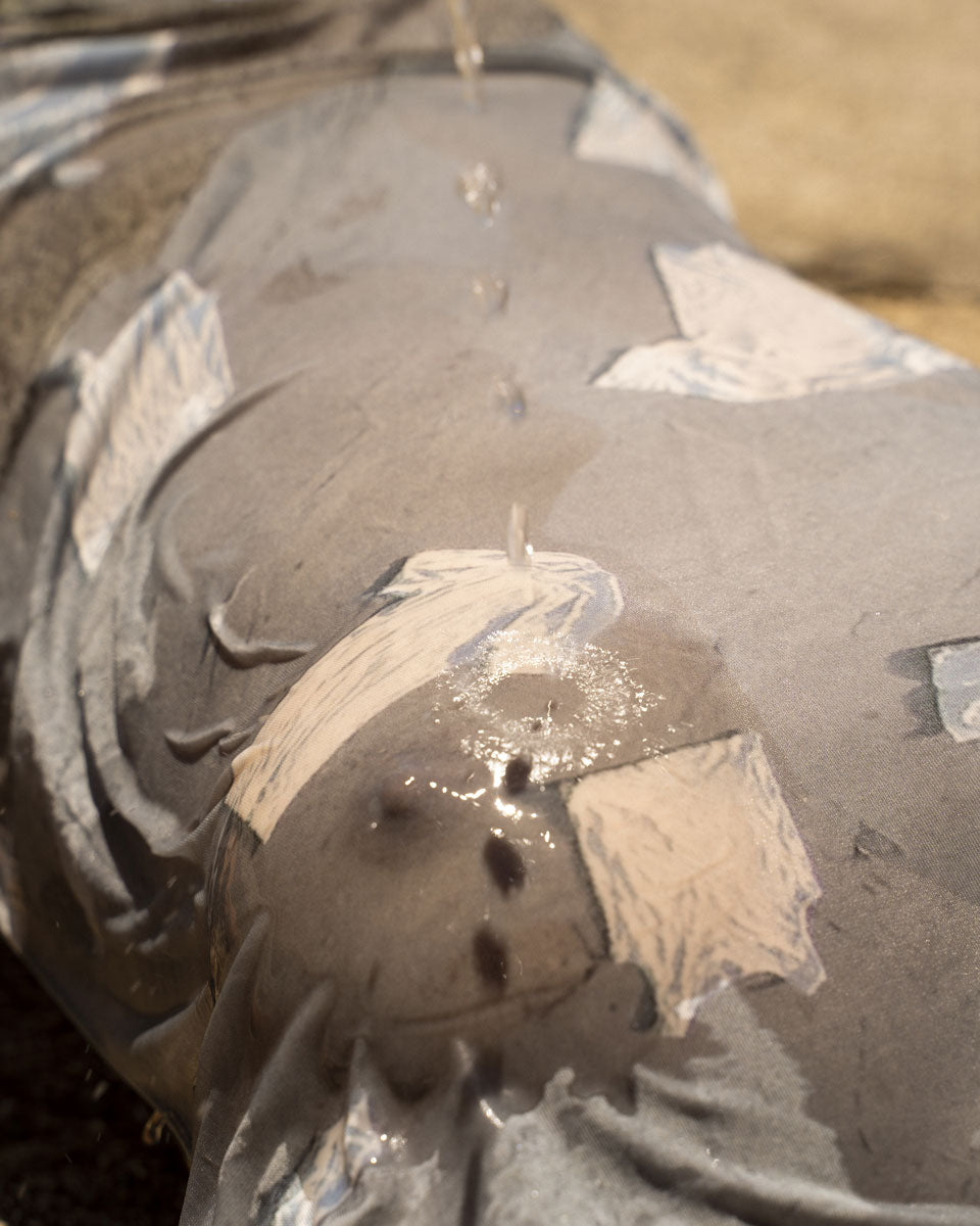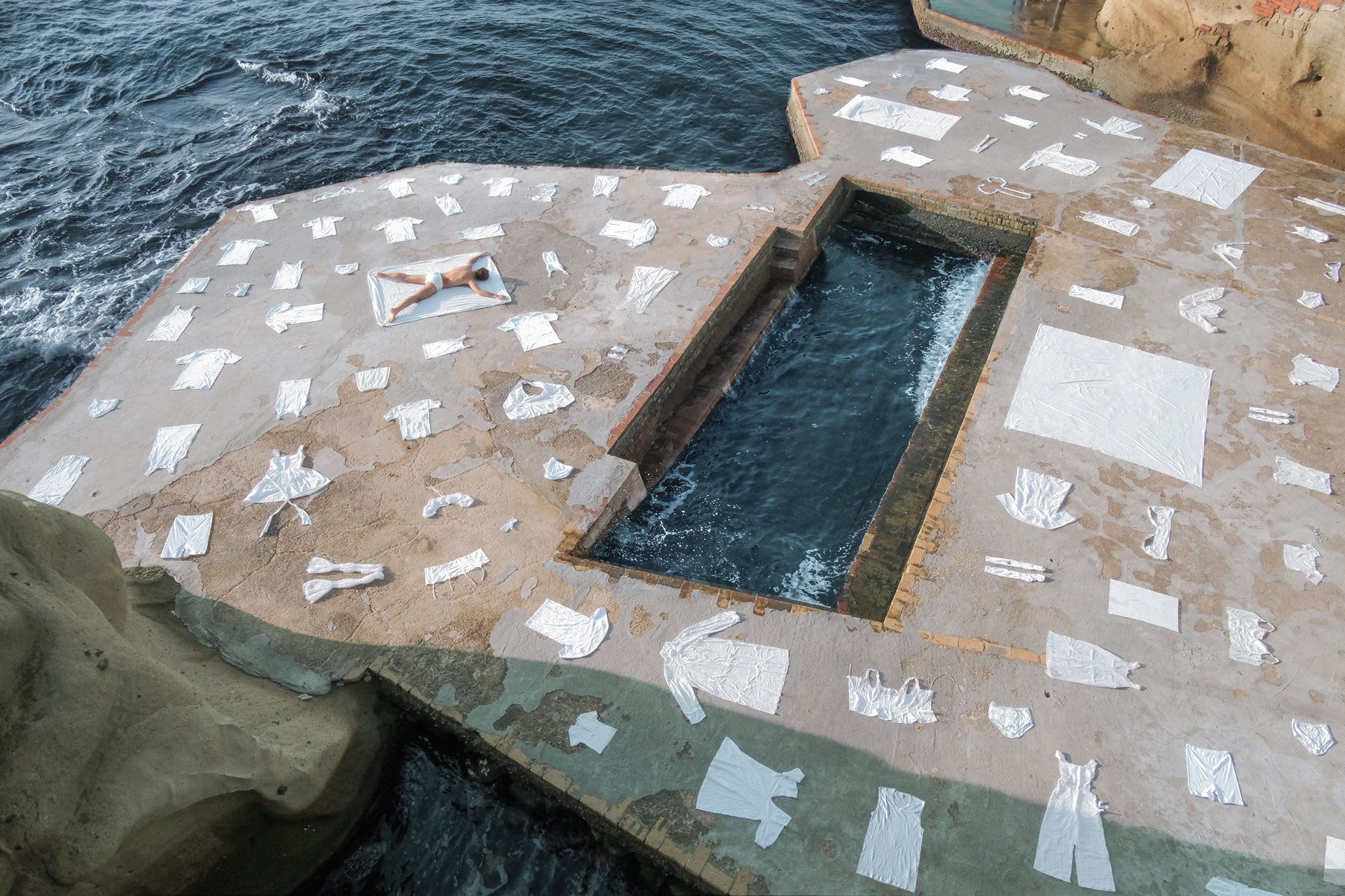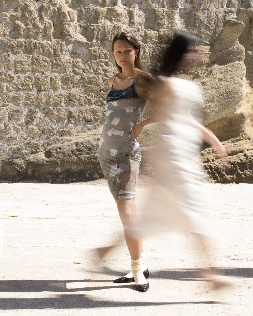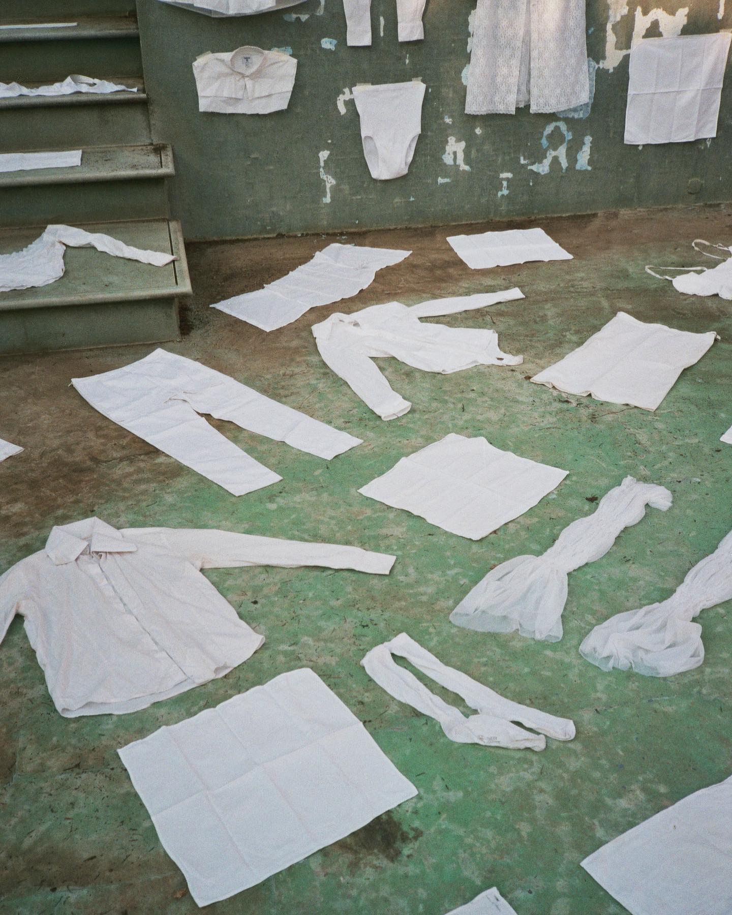 Behind the garments in Riccardo's practice there are elements of family, southern roots and intimate moments. In recent years his work has focused on the memories that clothes can hold and how they can express feelings and ideas. Riccardo treats garments like individual entities as he did in the picture he took for us last year in Posillipo, where he captured himself surrounded by numerous white garments on the ground. Inspired by these white, flat clothes we designed a limited capsule of white and grey pieces, along with two garments featuring Riccardo’s photo.