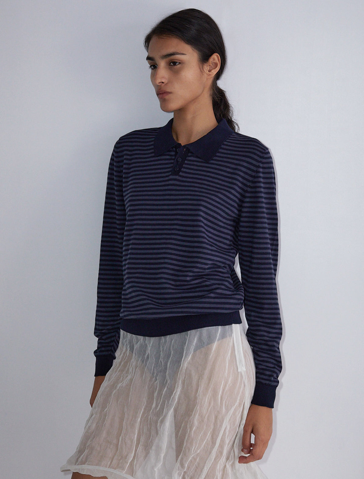 Slightly loose striped polo-style men's sweater. Soft and lightweight with a regular and comfortable fit.