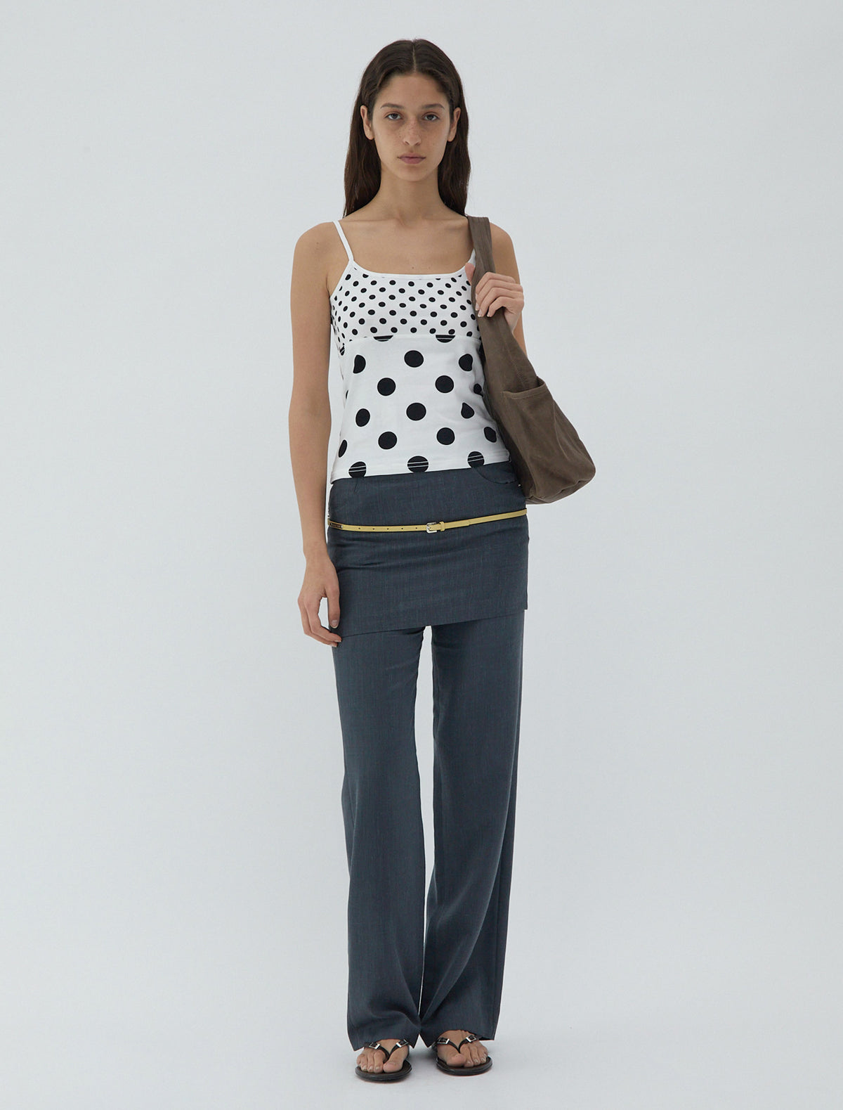 Reversible (inside-out) strappy polka dot top with yellow inner seam binding. Made from cotton fabric that’s not see-through. Regular fit, best suited for smaller busts.